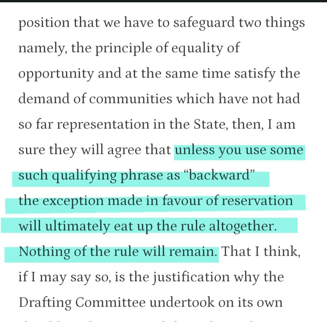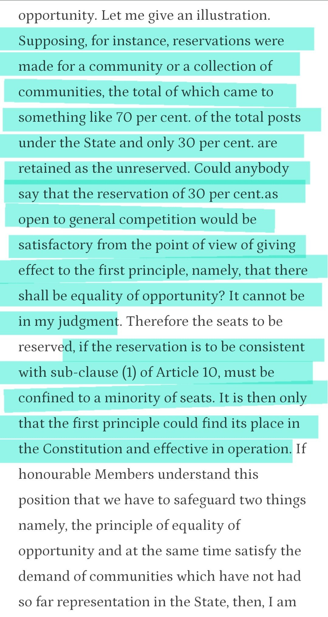 Dr. Ambedkar himself said this and made it clear that this exception (i.e. reservation), should not become a rule. The other members of the constituent assembly also believed reservation to be an exception to the “fundamental right to equality”.