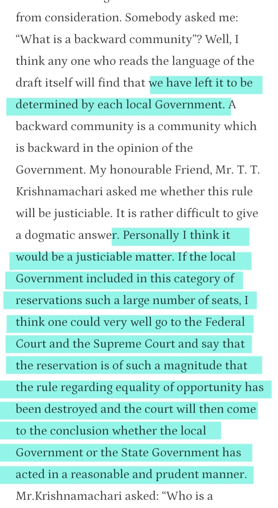 He had said that, if ever, reservation is increased to a larger share of seats (more than minority share), it could be challenged in courts, on the basis that the fundamental right to equality of opportunity was destroyed.